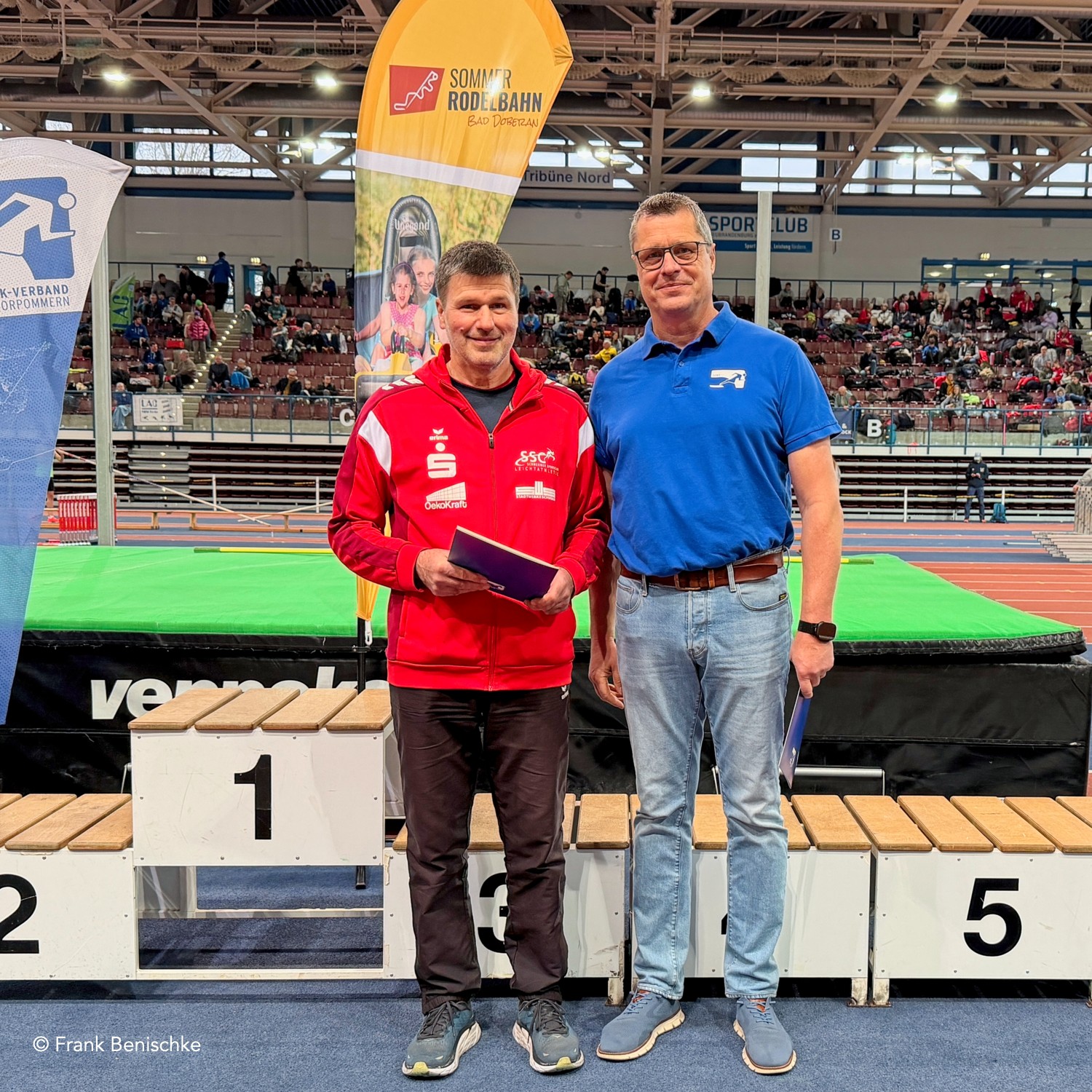 Der Leichtathletik-Verband Mecklenburg-Vorpommern ehrte im Rahmen der Landeshallenmeisterschaften zwei verdienstvolle, langjährige Mitstreiter in der Leichtathletik: