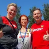 Petrus schickte unterschiedliches Wetter nach Tampere; beim Einstoßen mit Regen und beim Wettkampf bei bestem Sonnenschein und sehr warmen Temperaturen. Nach einem spannenden Wettkampf der 12 Teilnehmerinnen wurden Nadine Kant (W45) Weltmeisterin mit einer Weite von genau 13,00 m und Jeannette Denz (W 45) WM-Dritte mit einer Weite von 11,01 m.