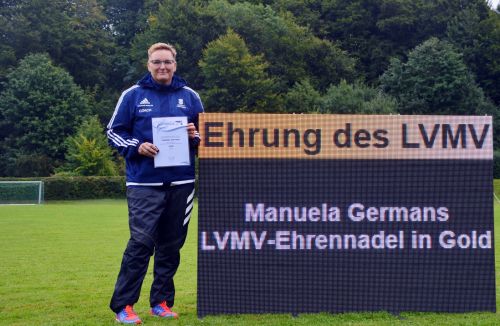 Manuela Germans erhielt am Samstag, dem 28.08.2021 im Rahmen der Landesmeisterschaften Mehrkampf der Kinder U10/U12 [&] Block U14 die „Ehrennadel in Gold“ des Landesverbandes Mecklenburg-Vorpommern.
