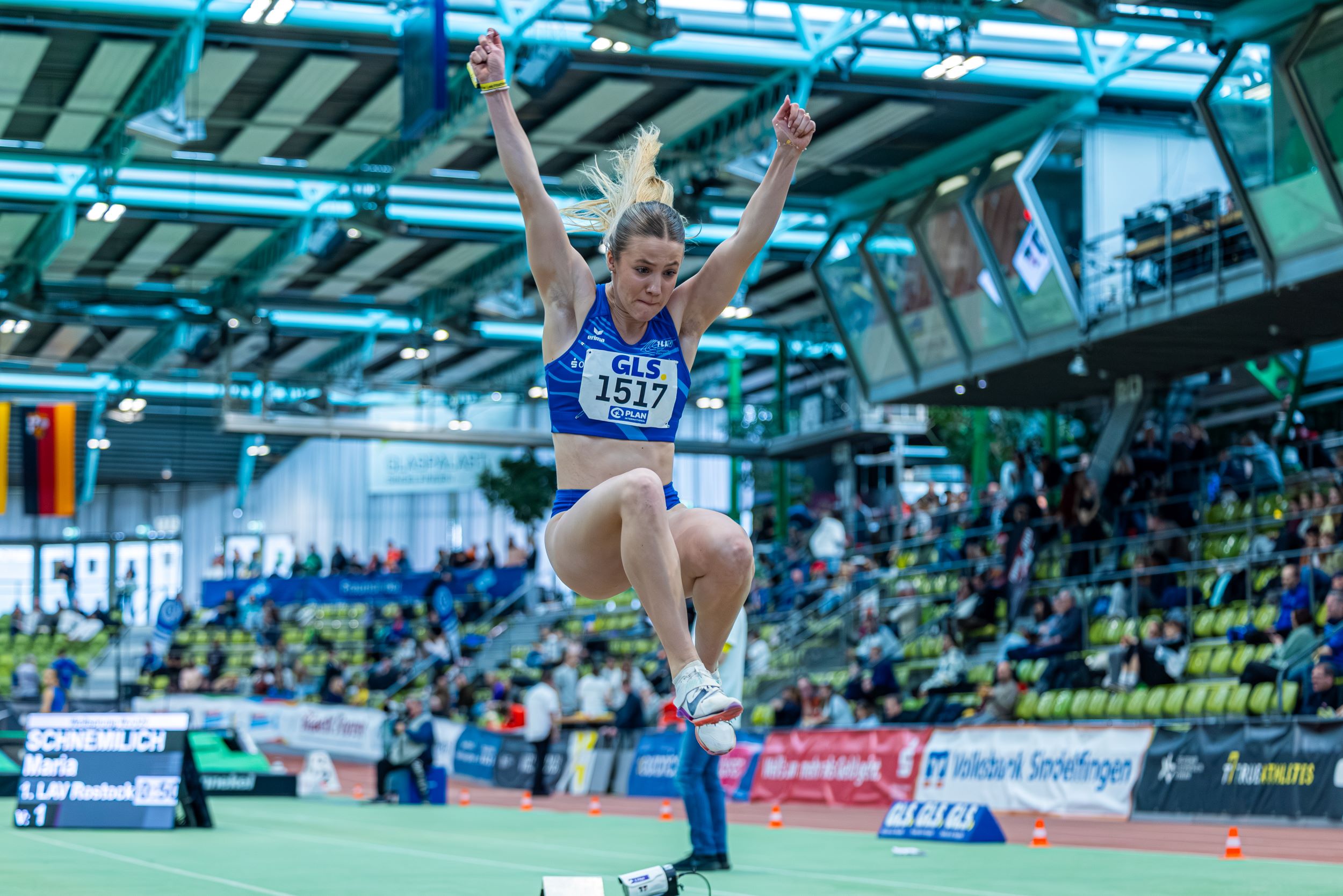 Für einen goldenen Auftakt sorgte Emily Scherf. Im Kugelstoßen der Weiblichen Jugend U20 stieß die U20-EM-Vierte des Vorjahres mit 16,43 Meter eine neue persönliche Bestweite und gewann als Titelverteidigerin souverän den Wettbewerb. Einen Tag später warf sie im Regen den Diskus auf 48,78 Meter und errang Silber. Die zweite Goldmedaille für Mecklenburg-Vorpommern holte Maria Schnemilich (1. LAV Rostock). Eine Woche zuvor Deutsche Mehrkampfmeisterin geworden, war sie auch im Weitsprung eine Klasse für sich. Schon mit dem ersten Satz auf 5,99 Meter hätte sie gewonnen, steigerte sich aber weiter und erzielte mit dem besten gültigen Sprung von 6,16 Meter eine neue Bestweite. Ihre Trainingskameradin Kimberly Opitz kam auf 5,97 Meter und machte den Doppelerfolg für die Hansestädter perfekt. Maria rundete ihr erfolgreiches Abschneiden mit Rang sechs über 60 Meter Hürden ab, touchierte dabei leider die vierte Hürde. Im Halbfinale sprintete sie mit 8,43 Sekunden eine neue persönliche Bestzeit, nur drei Hundertstel Sekunden über dem Landeshallenrekord.